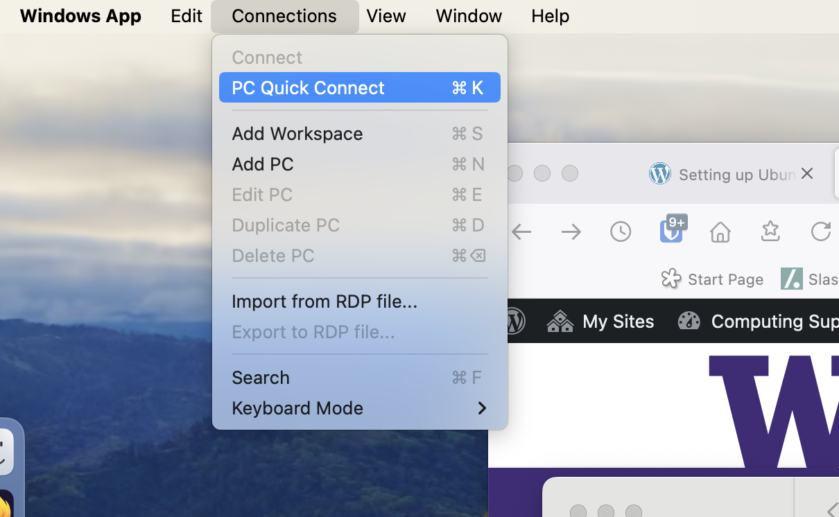 2. From the “Connections” menu, select “PC Quick Connect”: