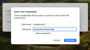 4. Type in your UW NetID and UW password. Replace ecetestuser1 with your own NetID, of course (and don’t preface it with “NETID\” – you’re not connecting to a Windows machine):