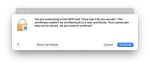 In the examples below, linux-lab-132.ece.uw.edu is being used (and the example user’s NetID is ecetestuser1, aka “ECE IT Test Account 1”). The images are from a Mac, but if you’re running Windows it should work very similarly.