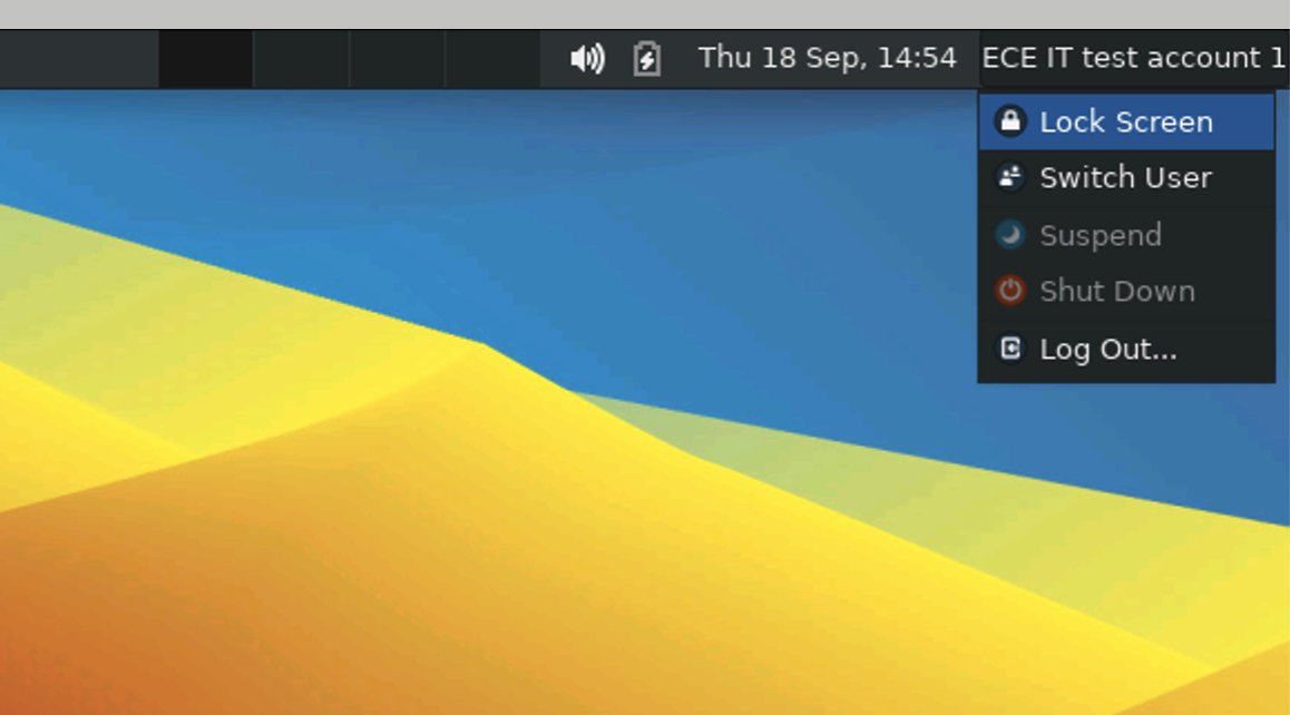 If you are leaving your session running, we strongly recommend locking your remote screen before disconnecting. Click on your name, to the upper right of the RDP window, to access the user menu.
