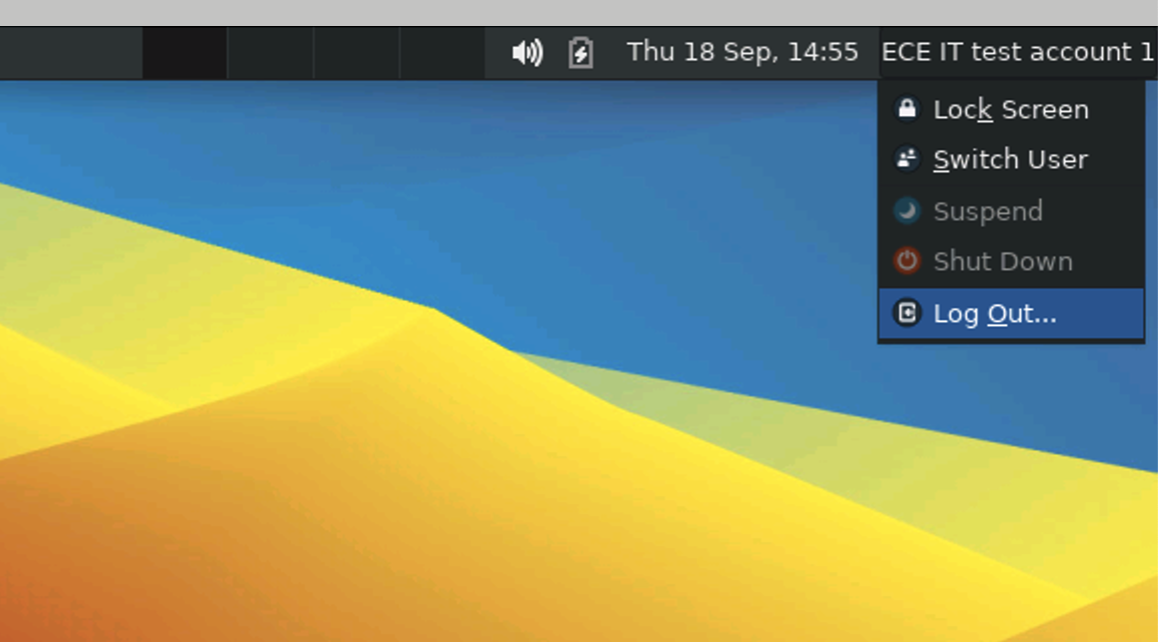 When you are done with all your tasks, log out. Click on your name, to the upper right of the RDP window, to access the user menu.